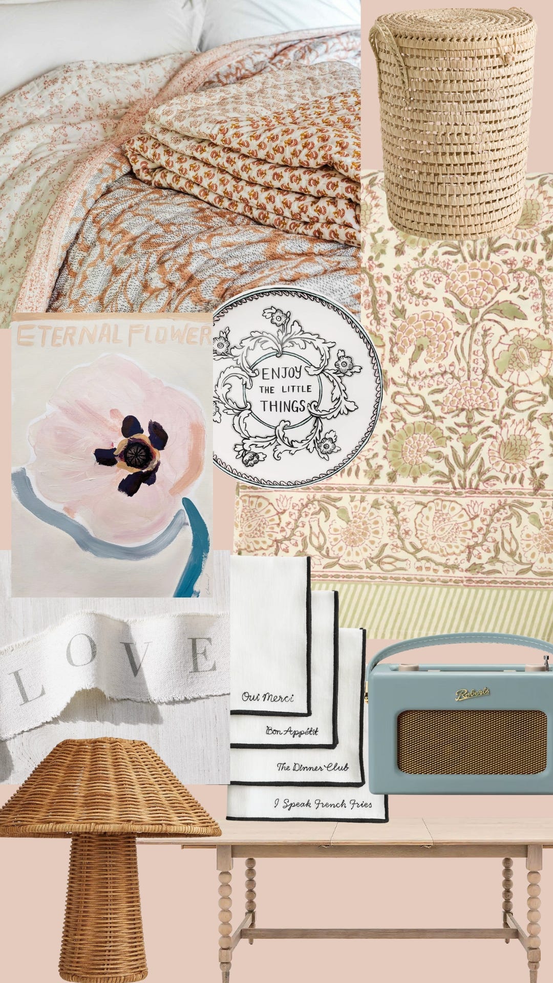 Graham & Green quilt | La Redoute laundry basket | Voi Collective tablecloth | Twig New York plate | Chiara Perano print | H&M napkins | Roberts radio | The White Company ribbon | Dunelm lamp | Dunelm table
